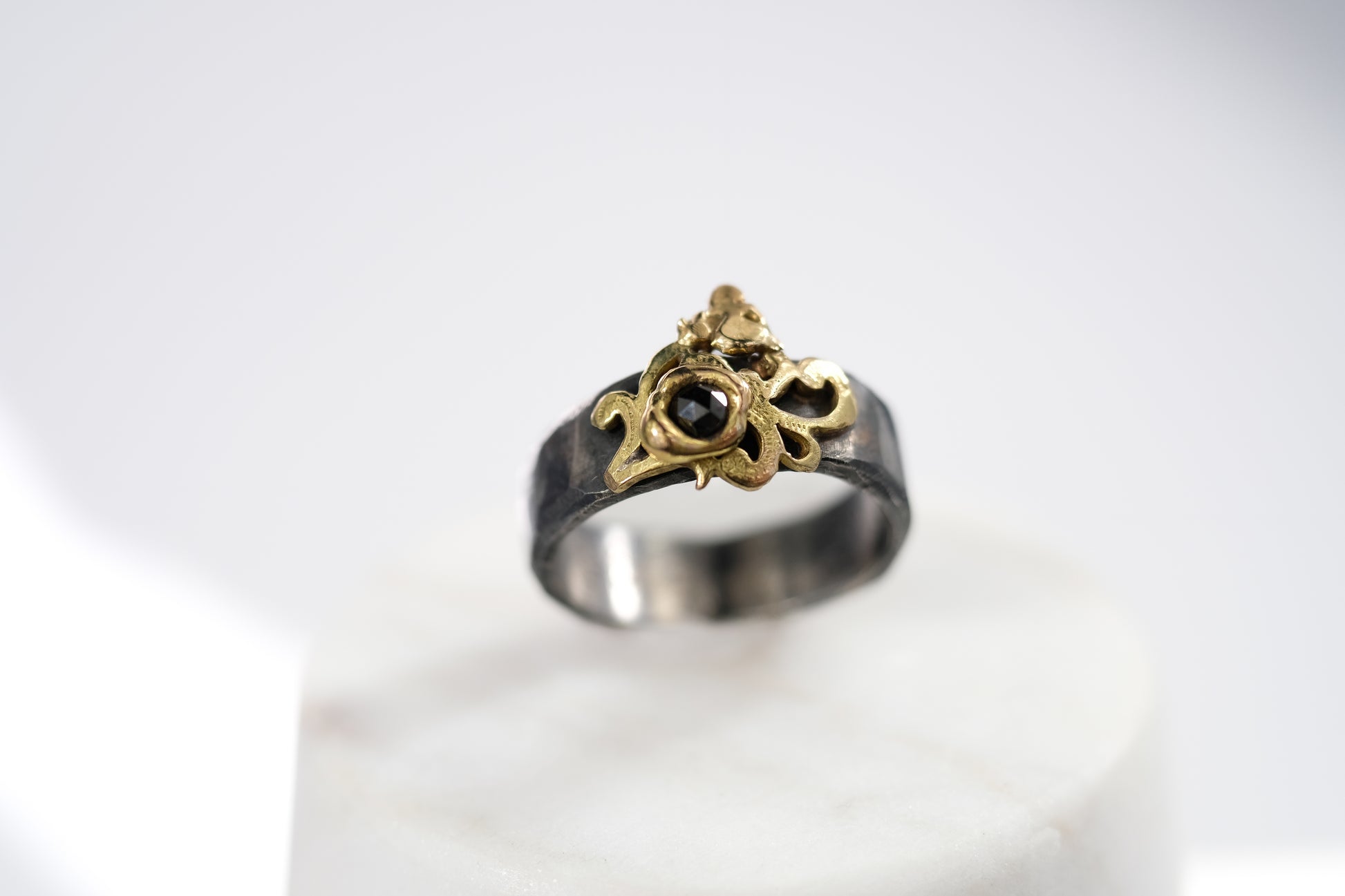This radiant One of a kind ring features a black rose cut diamond set amidst 18k gold lace work on an oxidized sterling silver hand forged shank.