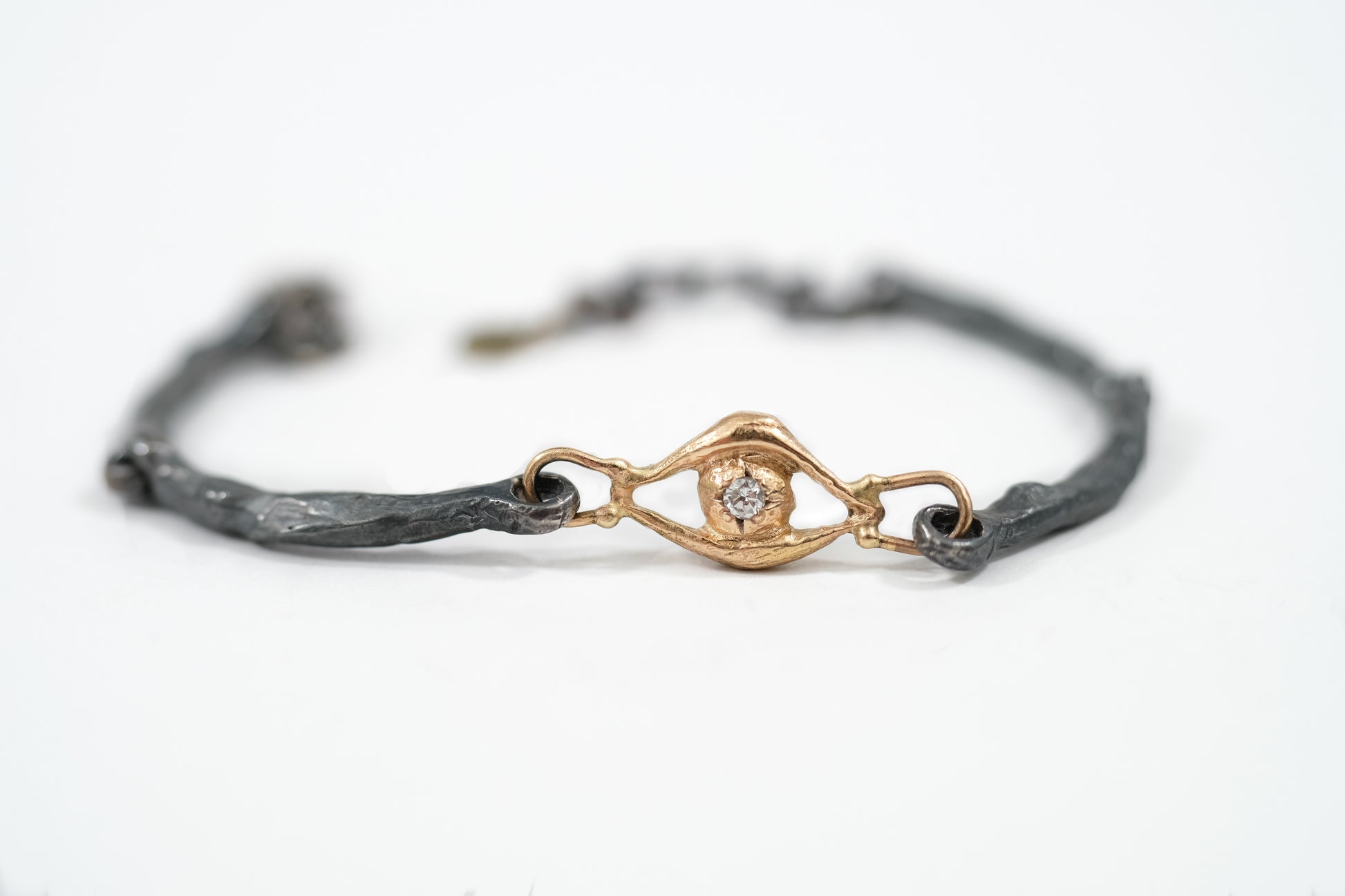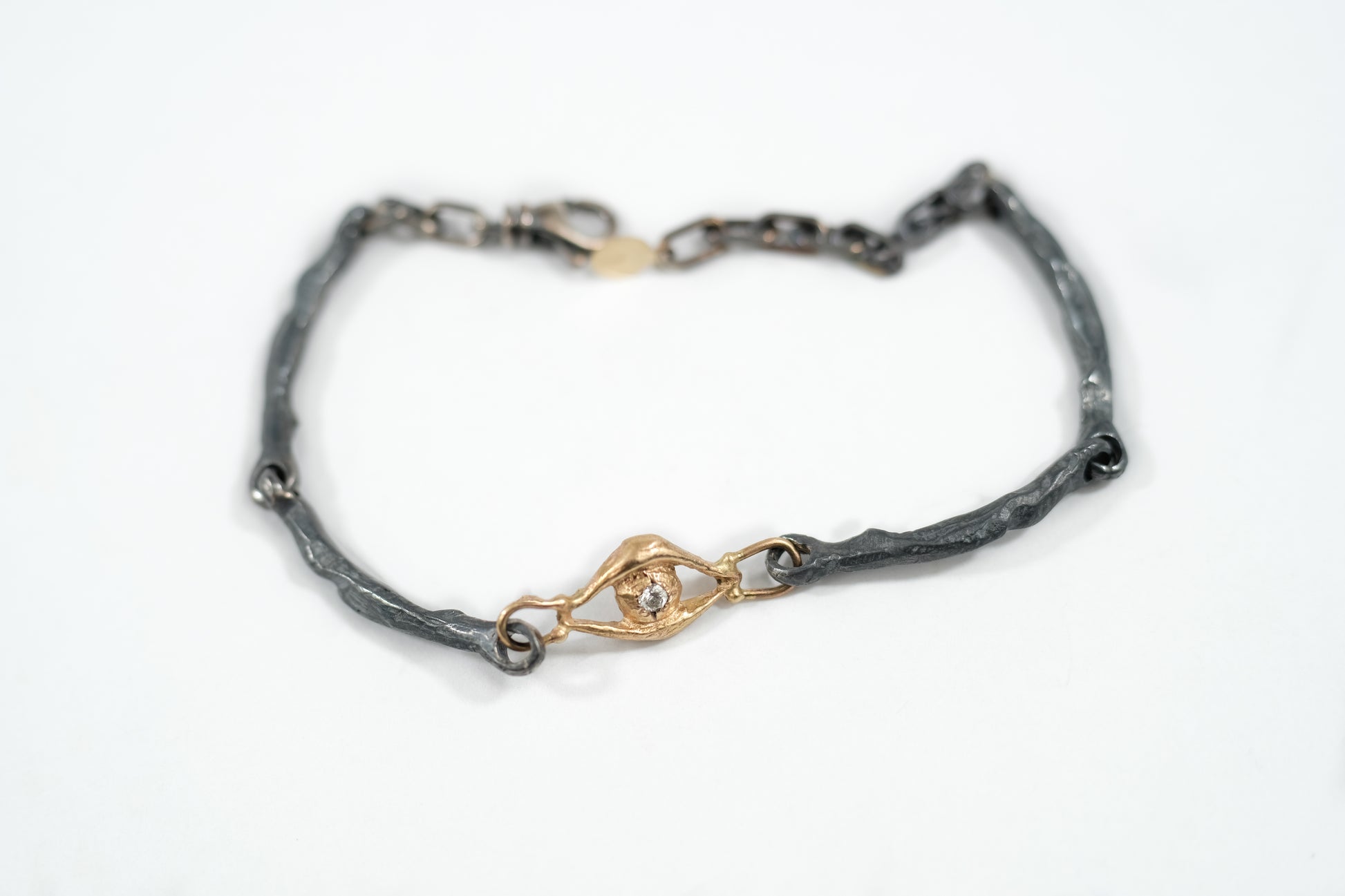 A hand carved eye cast in 14k gold featuring a brilliant white diamond iris. The carved oxidized sterling branches perfectly envelope the wrist of it's wearer. A perfect yet subtle Talisman of protection.