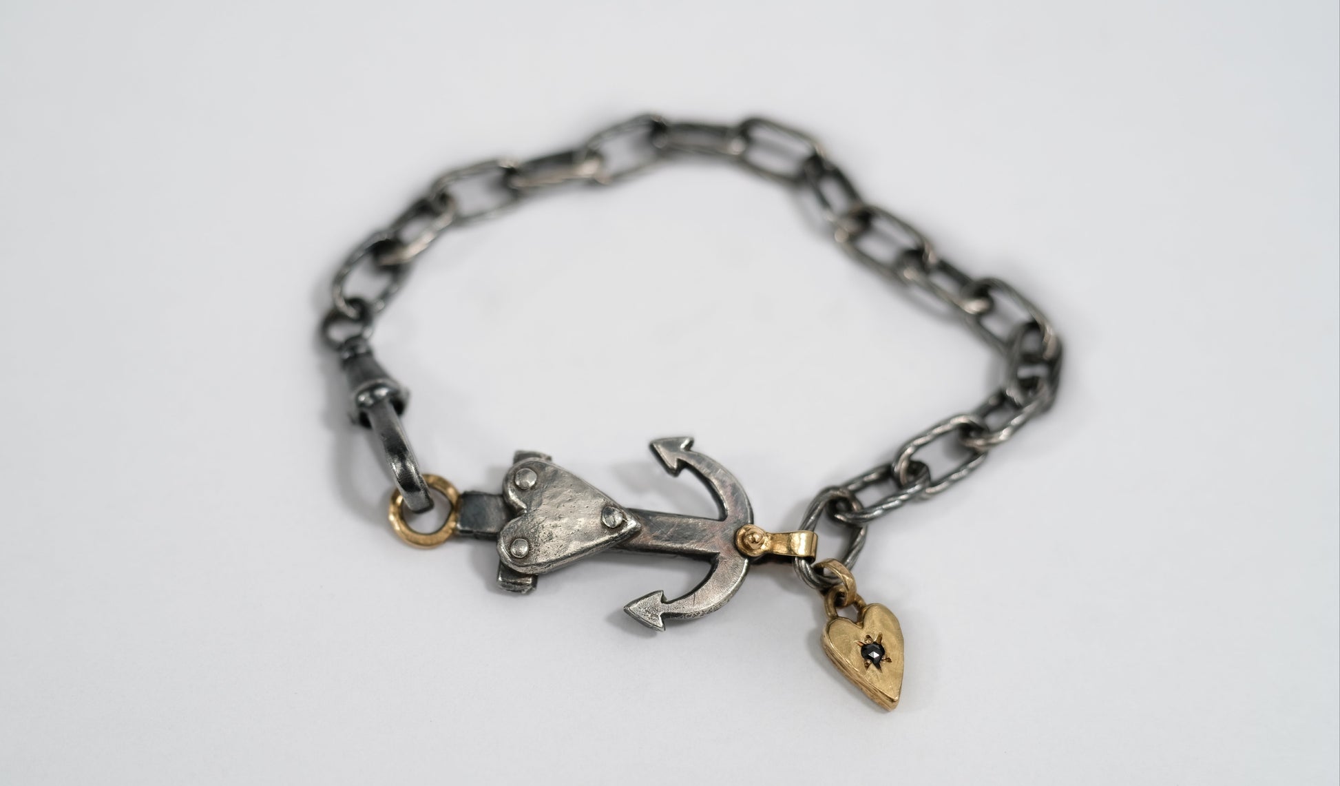 This is a classic Talisman bracelet for any Victorian loving Sailor girl at heart. The anchor, as you may know represents HOPE and who doesn't need more of that. Made in oxidized sterling silver with a chunky little 14k gold heart with a gorgeous rose cut black diamond. 14k gold riveted bail end and top end. The dog clasp closure is another nod to the Victorian era.