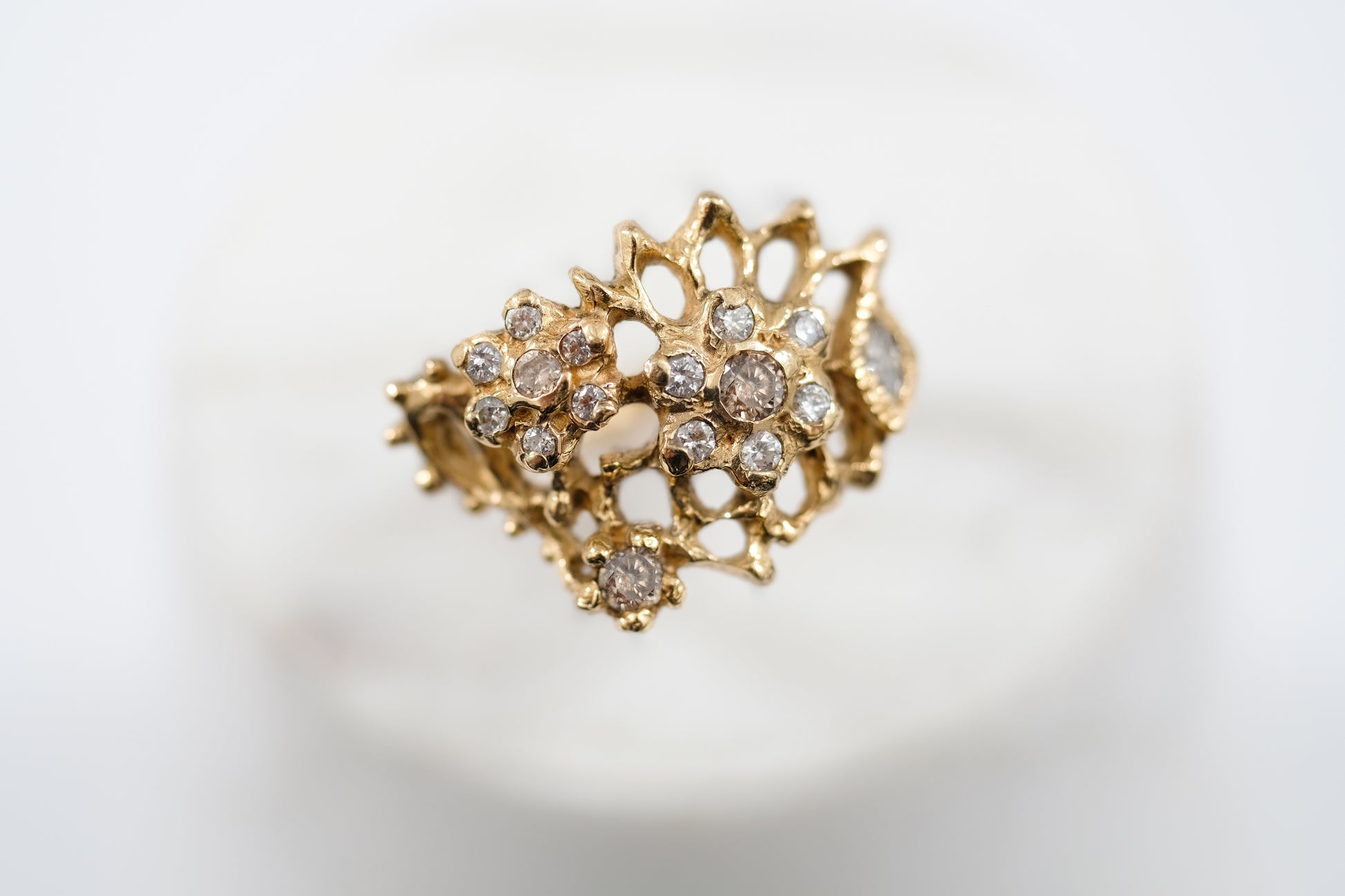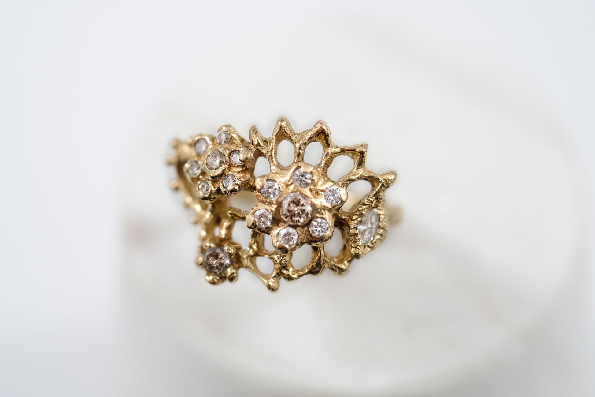 Dreaming of the most beautiful Indian Damask silk or old world European lace, I hand carved this stunner over many hours and days. It sits wide and low on the finger, giving it the most comfortable statement ring status. Featuring gorgeous white diamonds in 14k gold. Size 7. can be resized