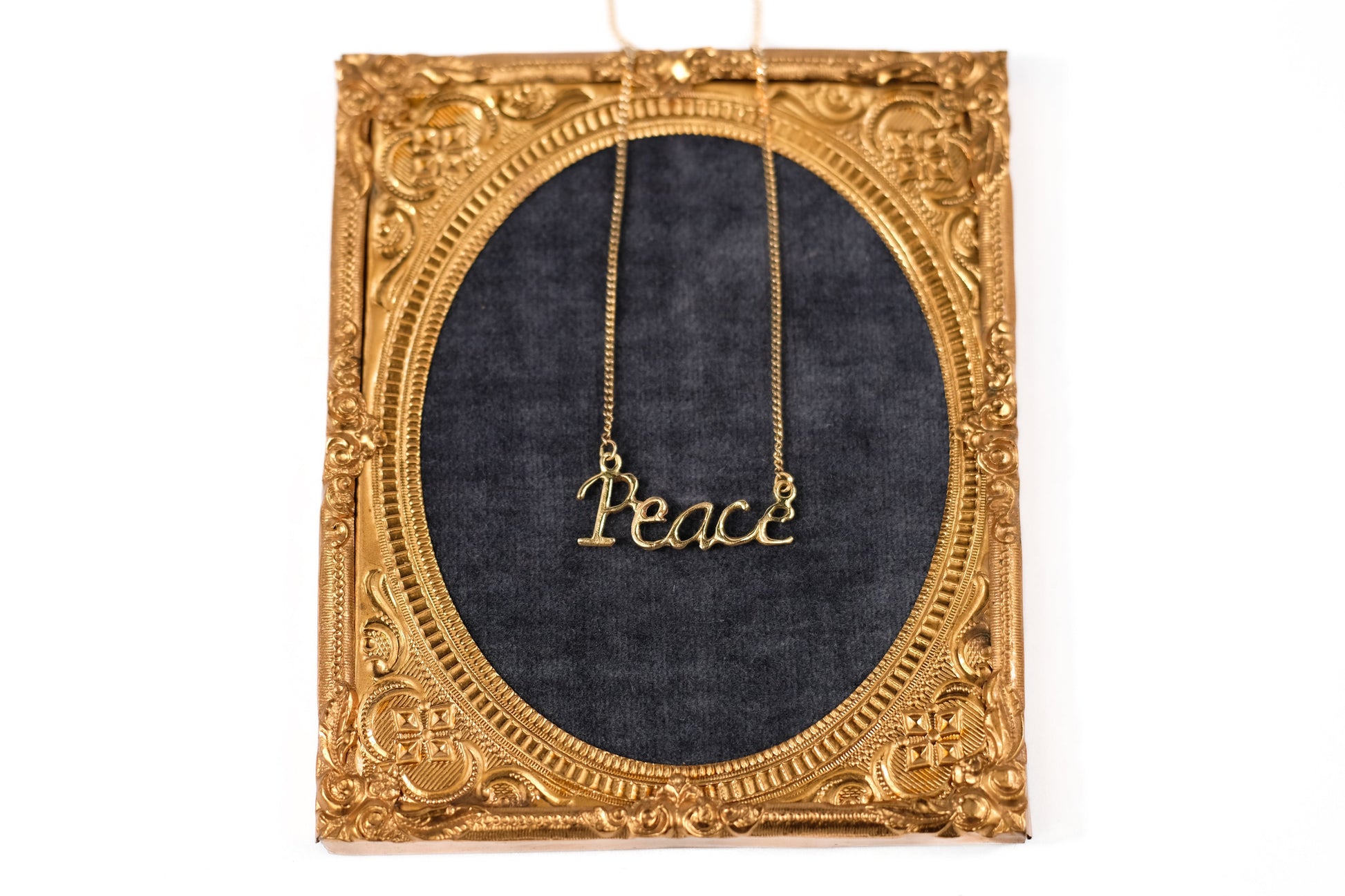 The Peace necklace was inspired by the classic name plate, like Carrie's in Sex and the City. Hand made in 14k gold with a delicate 14k gold chain.