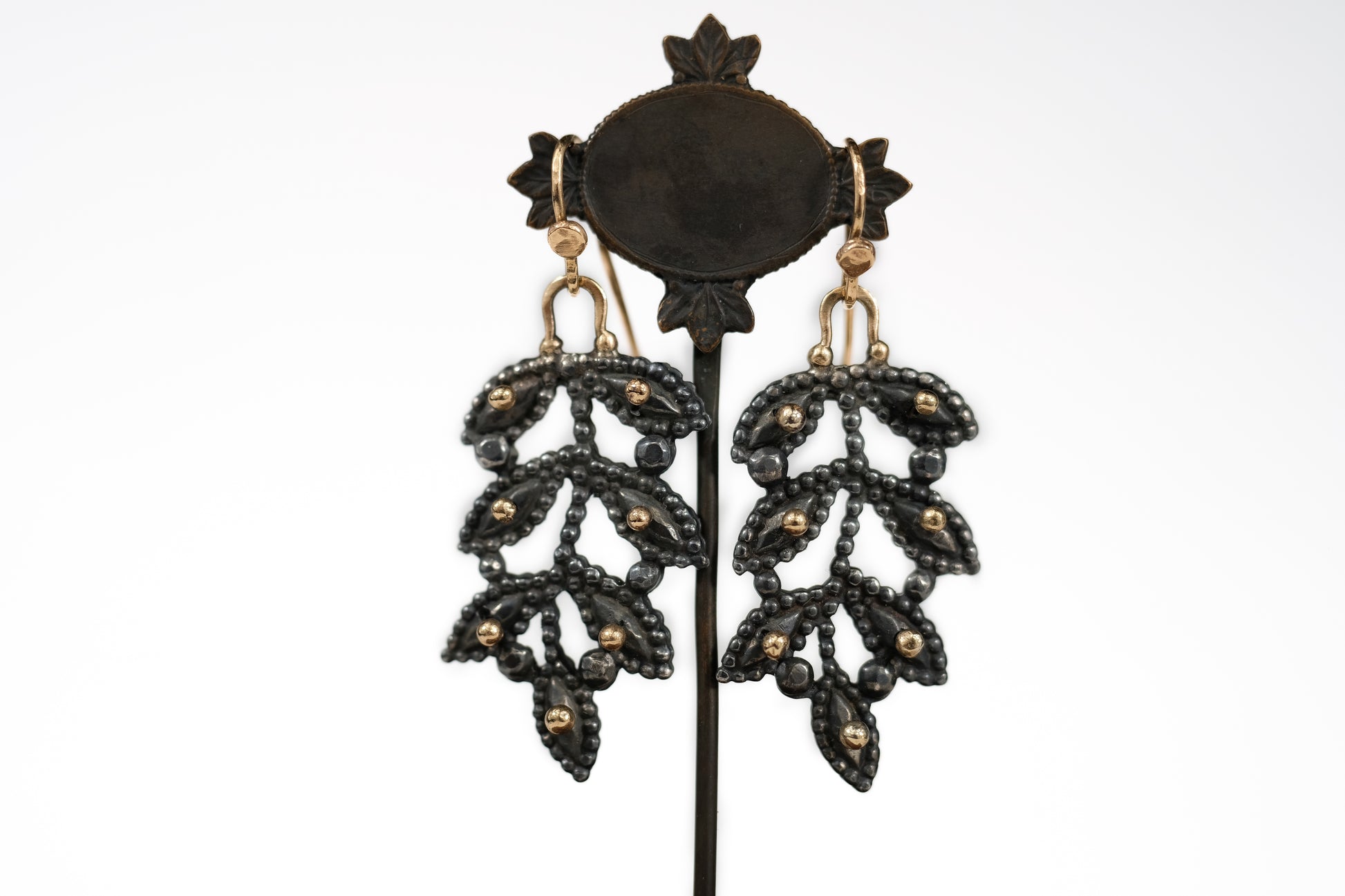 I have always adored cut steel jewelry from the Victorian age. I made a mold of one and cast sterling silver replicas. I then drilled holes and torch balled 14k gold wire, piercing through each leaf. The gold is seen both in front and behind. The beloved Horseshoe Finial and 14k ear wire make these danglers the perfect statement for the Modern Bohemian.