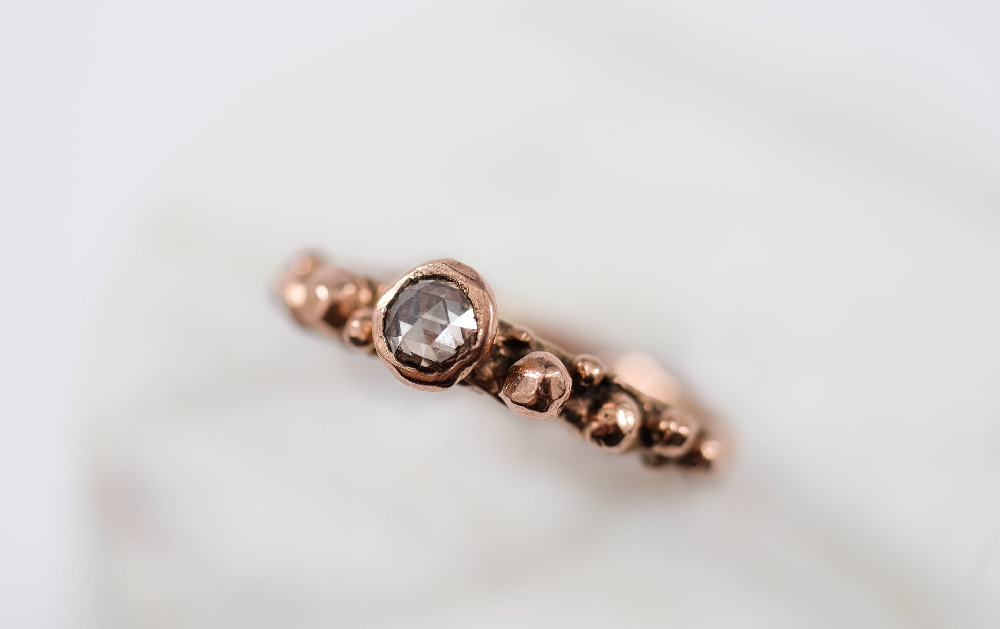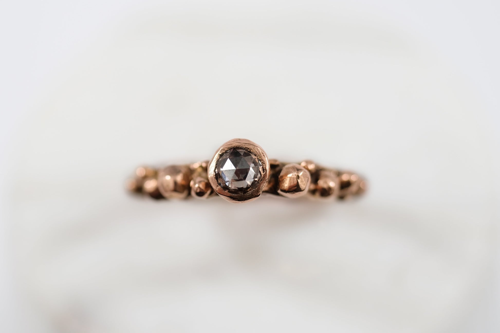 A luminous solitary Rose cut diamond sits atop a band of 14k rose gold with faceted nuggets that echo the dimensions of the diamond. Hand carved and cast in 14k rose gold