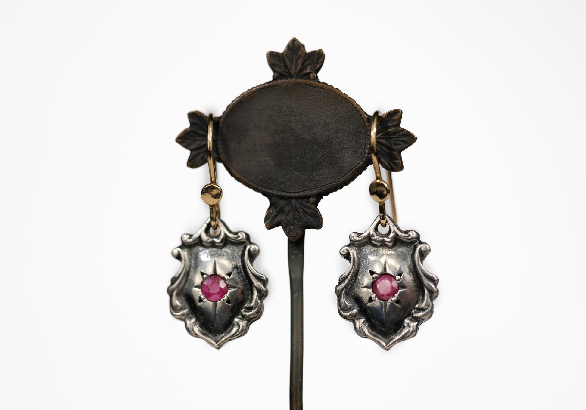 Old world charm in these beautiful sterling silver crest earrings, featuring juicy, natural rose cut rubies. The 14k gold ear wires are my signature hammered ball ends.