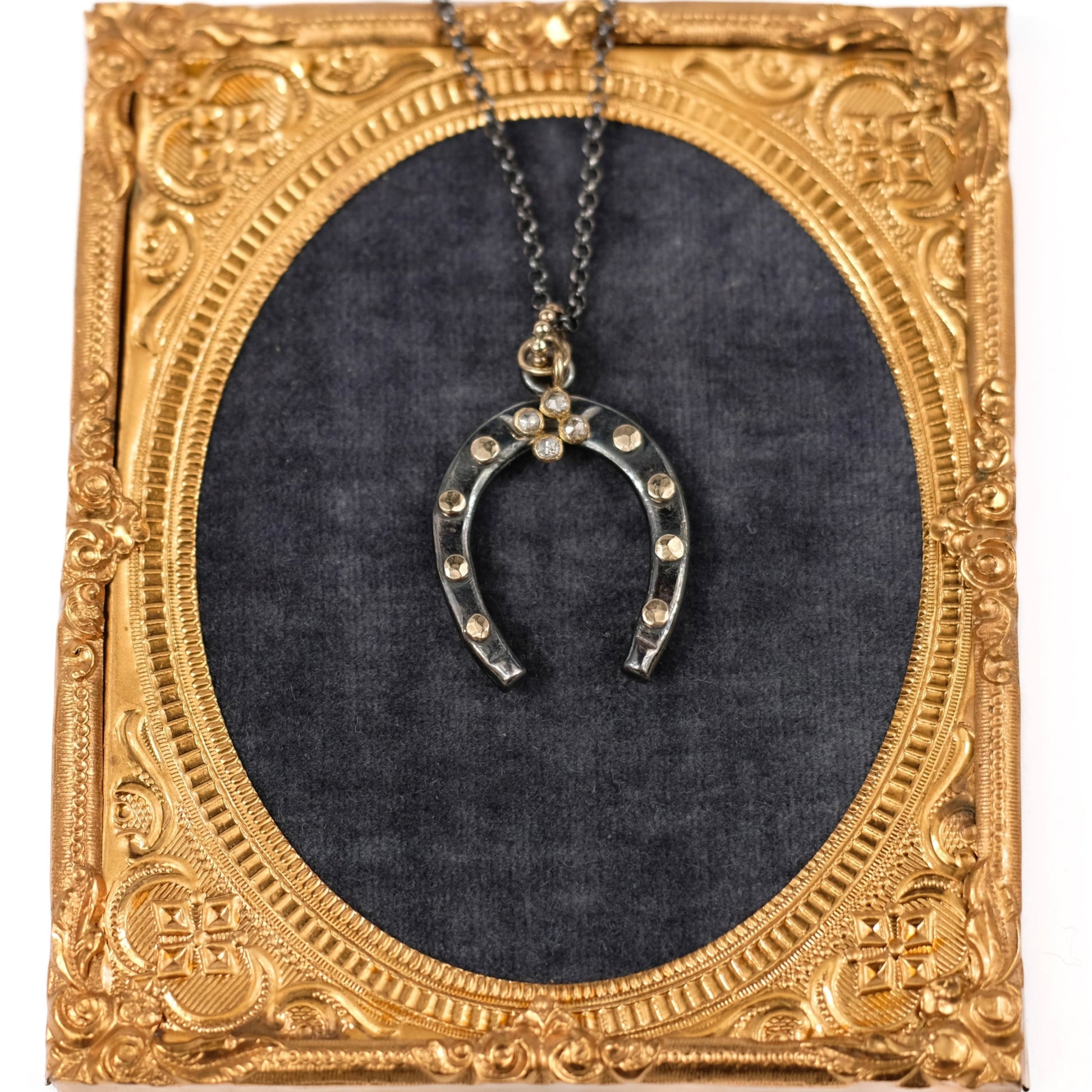 What could be luckier than a gorgeous oxidized sterling Horseshoe riveted with 8 14k gold "nails" floating atop from the center of the gold bail is a clover of 4 brilliant rose cut diamonds set in 18k gold.